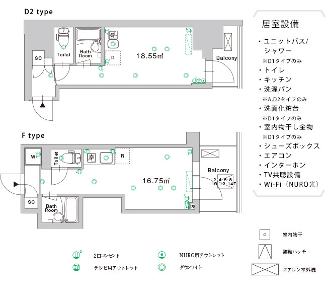※1 D1タイプのみユニットバスではなく、シャワーブースを備えた住戸となっています。